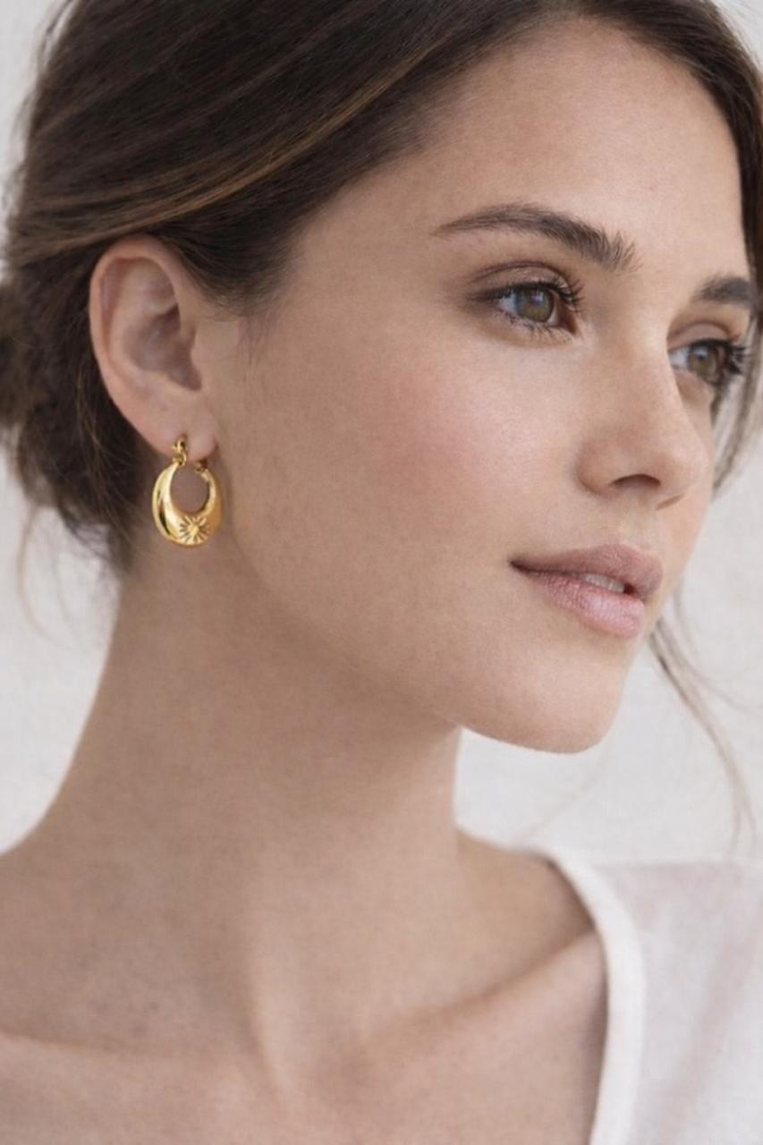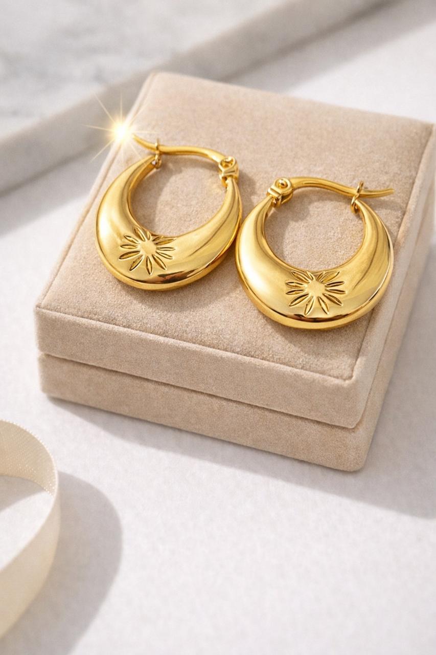 Make a bold yet elegant statement with the Aurora Sun Hoop Earrings. Designed in a smooth crescent silhouette with a delicate sunburst engraving, these earrings bring together modern luxury and timeless charm. Their polished gold finish adds a radiant glow, making them perfect for festive looks, date nights, and everyday styling.