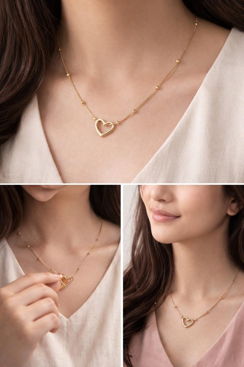 The Eliora Heart Charm Necklace features a fine gold-tone chain accented with subtle bead details and a graceful open heart pendant. Designed for modern minimalism, this piece adds a refined touch of everyday luxury to any look.