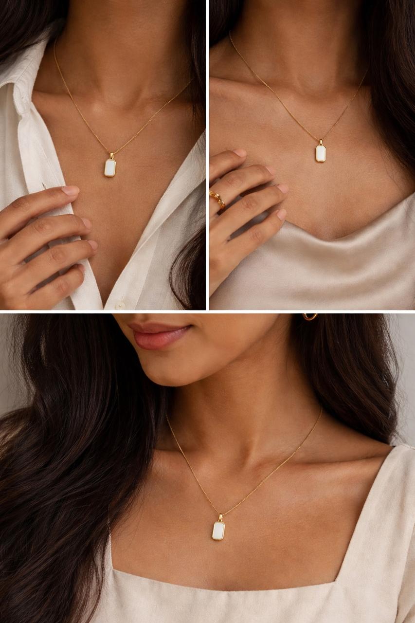 A sleek gold chain paired with a minimal white rectangular pendant that adds a touch of elegance to any outfit. Designed